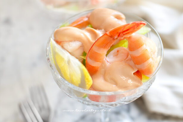 Il Cocktail di gamberi è un antipasto di pesce della cucina anni '80: gamberi o gamberetti in salsa rosa serviti in bicchiere da Cocktail