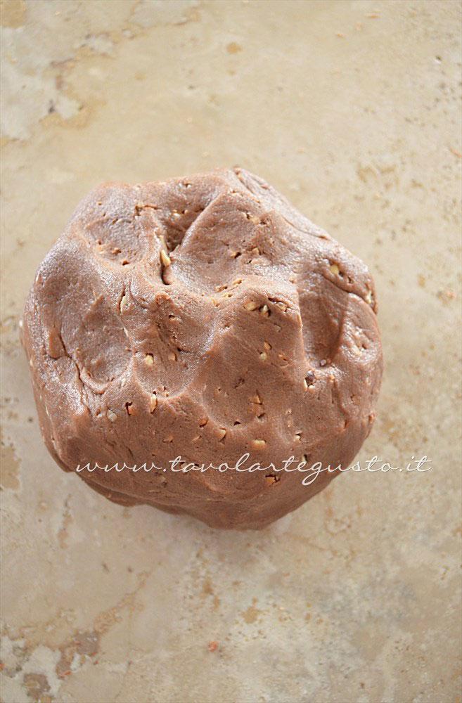 Trasferite l’impasto su un piano di lavoro che non incolla (marmo, alluminio, plastica) aggiungete al centro le nocciole ridotte in granella :