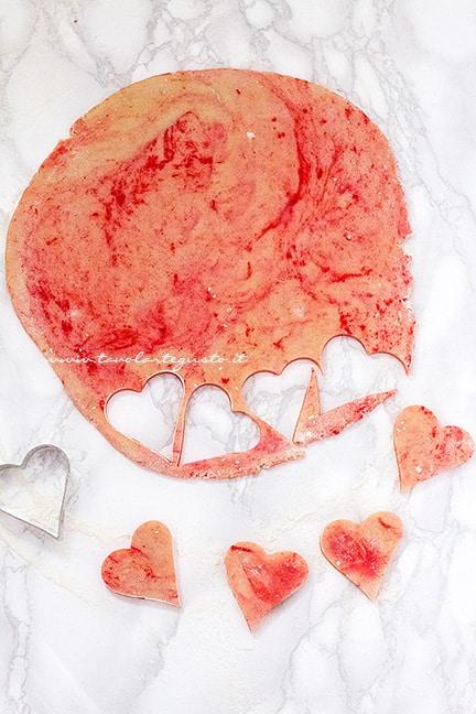 I Biscotti marmorizzati ovvero i Marbled Sugar Cookies sono dei golosi dolcetti di pasta frolla variegata con il vostro colore preferito, che seguono lo stesso metodo dalla Torta marmorizzata . In questo caso colore rosso, ma potete creare “l’effetto marmorizzato” con il colore che volete , di più colori oppure optare per variegare l’impasto un pò di pasta frolla al cacao. Originali, bellissimi da vedere e super golosi, i Biscotti marmorizzati sono l’ultimo trend che sta letteralmente spopolando in America! Sapete quanto io ami i biscotti particolari, ecco che ho pensato di regalarvi la Ricetta dei Biscotti marmorizzati che tra le altre cose sono veramente facilissimi!! Li possono fare anche i bambini sporcandosi le mani del colore che volete! Non ci sono grandi regole né schemi da seguire, basterà solo mescolare pochissimo per non uniformare troppo il colore all’impasto e voilà! Dopo un pò di riposo in frigo la frolla marmorizzata sarà pronto da stendere! Per la realizzazione, potete scegliere il taglia biscotti che volete! Io ho scelto cuori e colore rosso per realizzare dei biscotti marmorizzati perfetti da regalare insieme ai Biscotti a forma di cuore oppure i Biscotti di natale. Ma voi potete optare a seconda dell’occasione in cui volete preparali per la forma che volete! Il risultato vi conquisterà non solo per il colore brillante e l’effetto marmorizzato originalissimo, ma per il gusto squisito! I biscotti marmorizzati sono buonissimi, profumati alla vaniglia e dalla consistenza deliziosa che si sciolgono in bocca! Provateli presto e fatemi sapere che colore, gusto e forma avete dato ai vostri biscotti marmorizzati!