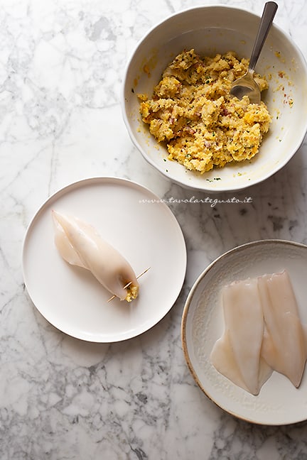 A questo punto riempite i calamari con il composto, lasciando naturalmente un pò di bordo per richiudere con stuzzicadenti.