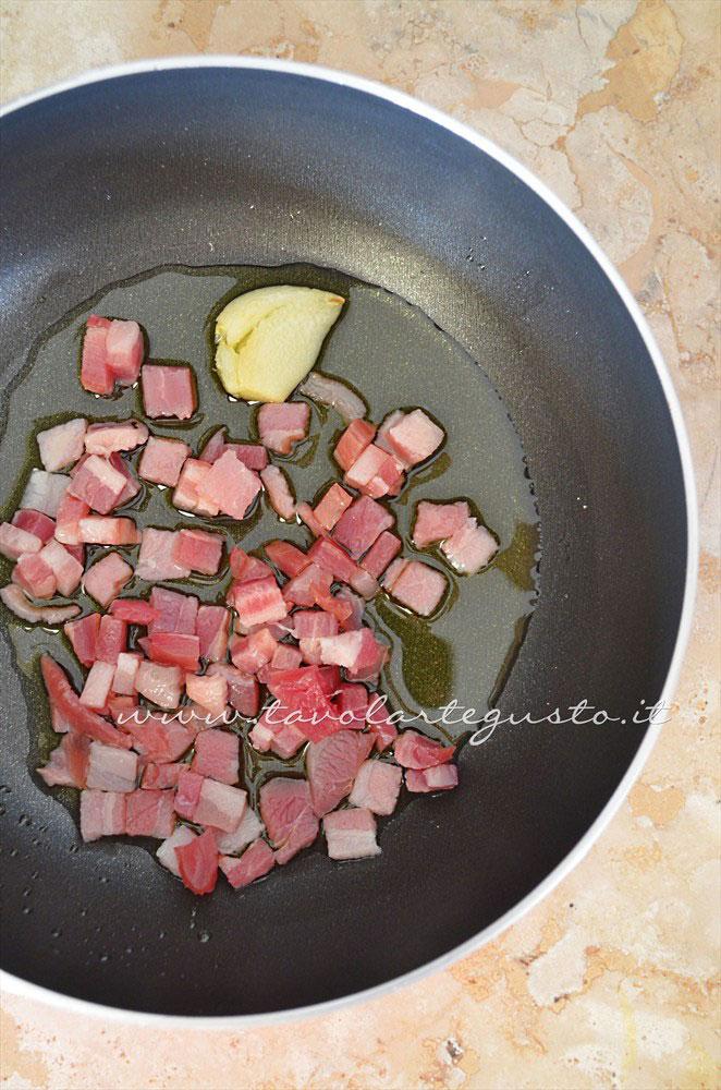 Infine aggiungete in padella l’aglio sbucciato e leggermente schiacciato e la pancetta affumicata e lasciate rosolare 5 – 6 minuti a fiamma moderata insieme ai cavoletti di Bruxelles in padella: