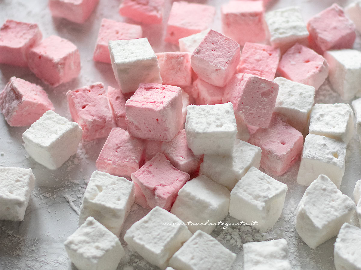 Se volete realizzare dei marshmallow fini e più piccoli, basterà semplicemente tagliare a quadretti di 1 cm, per rendere agevole l’operazione utilizzate un coltello affilato molto tagliente e liscio