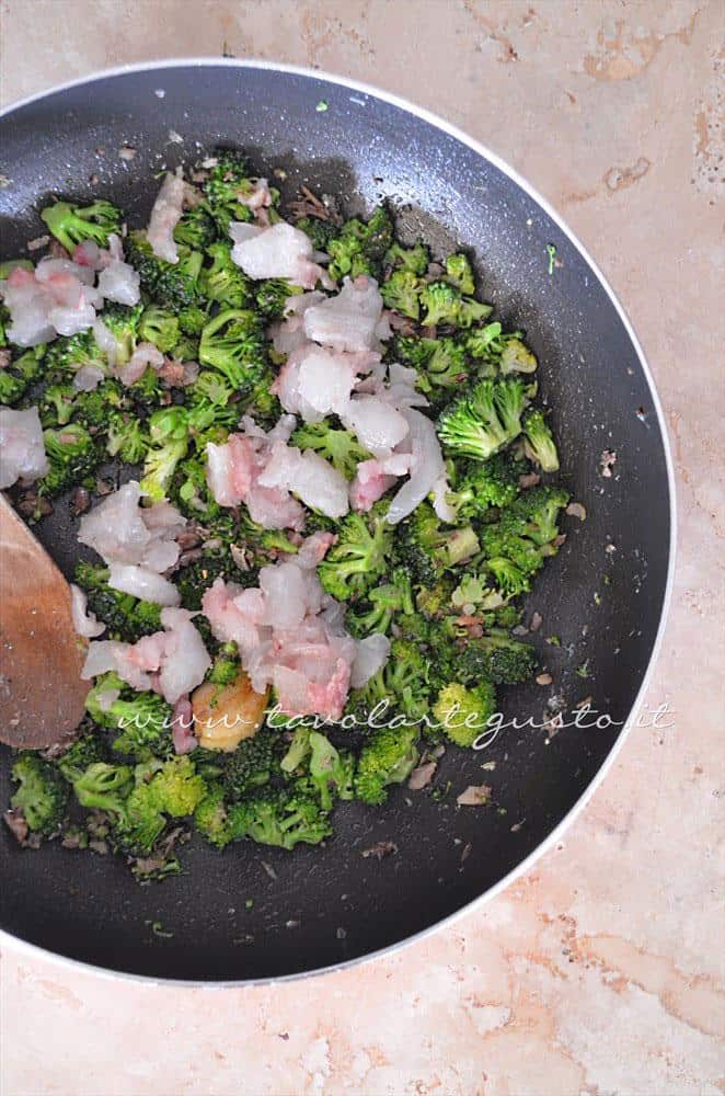 Poi a parte ponete in una padella l’olio, il burro, l’aglio e se gradite un peperoncino, lasciate soffriggere i broccoli per 2 minuti