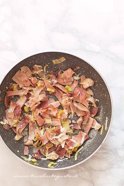In una padella a parte, ponete il resto del porro con 2 cucchiai di olio, lasciate soffriggere fino a doratura per 1 ‘ circa e aggiungete lo speck precedentemente affettato a pezzetti.