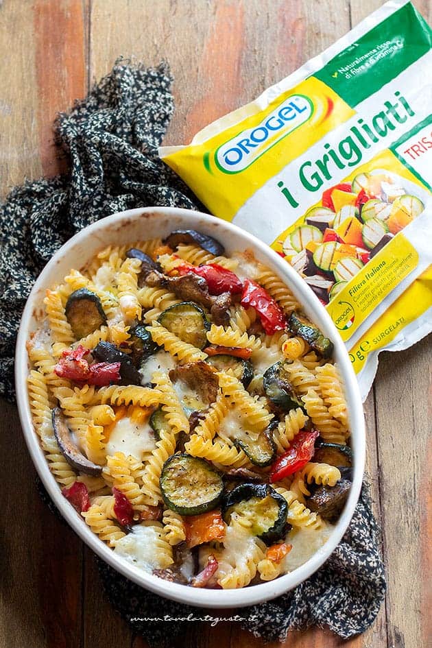 La Ricetta semplice, velocissima e perfetta da realizzare in tante varianti! Potete utilizzare la pasta che preferite, dai fusilli alle penne, dai paccheri ai maccheroni. La besciamella light si prepara in 5 minuti esatti e per velocizzare ancora di più il piatto ho utilizzato verdure grigliate Orogel , un mix di zucchine, melanzane e peperoni che basta scaldare in padella con un filo d’olio pochi minuti e aggiungere direttamente al condimento! Una soluzione golosissima e salva tempo! In alternativa potete grigliare voi stessi le verdure che avete a disposizione in frigo: vanno bene anche carote, cipolle, pomodori, spinaci a seconda della stagione; oppure potete utilizzare un mix di Verdure al forno ! Insomma come preferite! il risultato sarà una pasta al forno vegetariana da leccarsi i baffi! gustosa ma senza troppi sensi di colpa! con lo stesso procedimento potete realizzare una Pasta al forno senza glutine vegetariana. Proprio come la Pasta alla sorrentina è ottima calda, fredda oppure il giorno dopo! Potete preparala con largo anticipo e trasportarla in gita, in spiaggia; arricchire un Buffet, Feste di compleanno! Ideale non solo per l’estate, ma per ogni stagione! a seconda delle verdure che utilizzate!