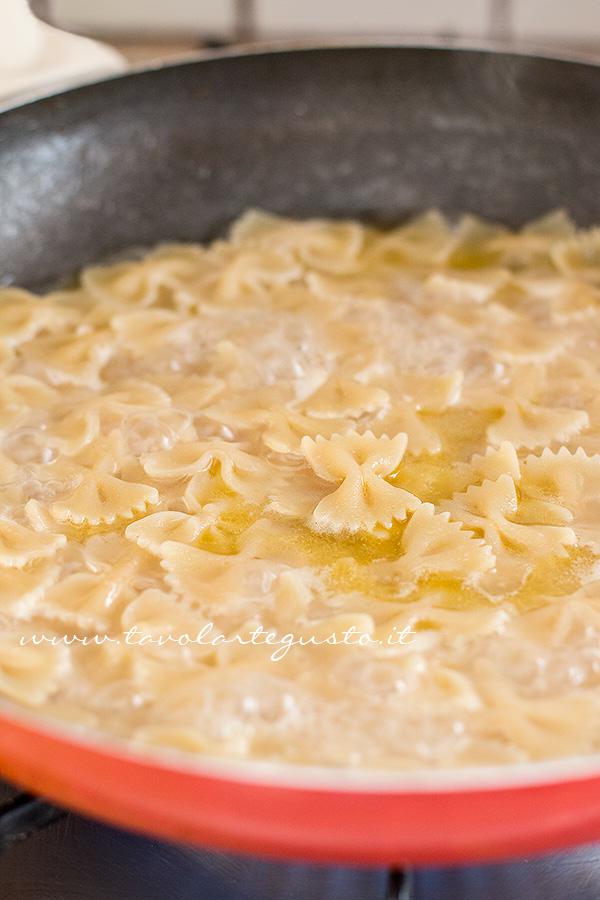 Lasciate soffriggere 1′ a fiamma moderata, aggiungete le farfalle crude in padella, girate con un cucchiaio di legno e lasciate tostare per circa 1 minuto
