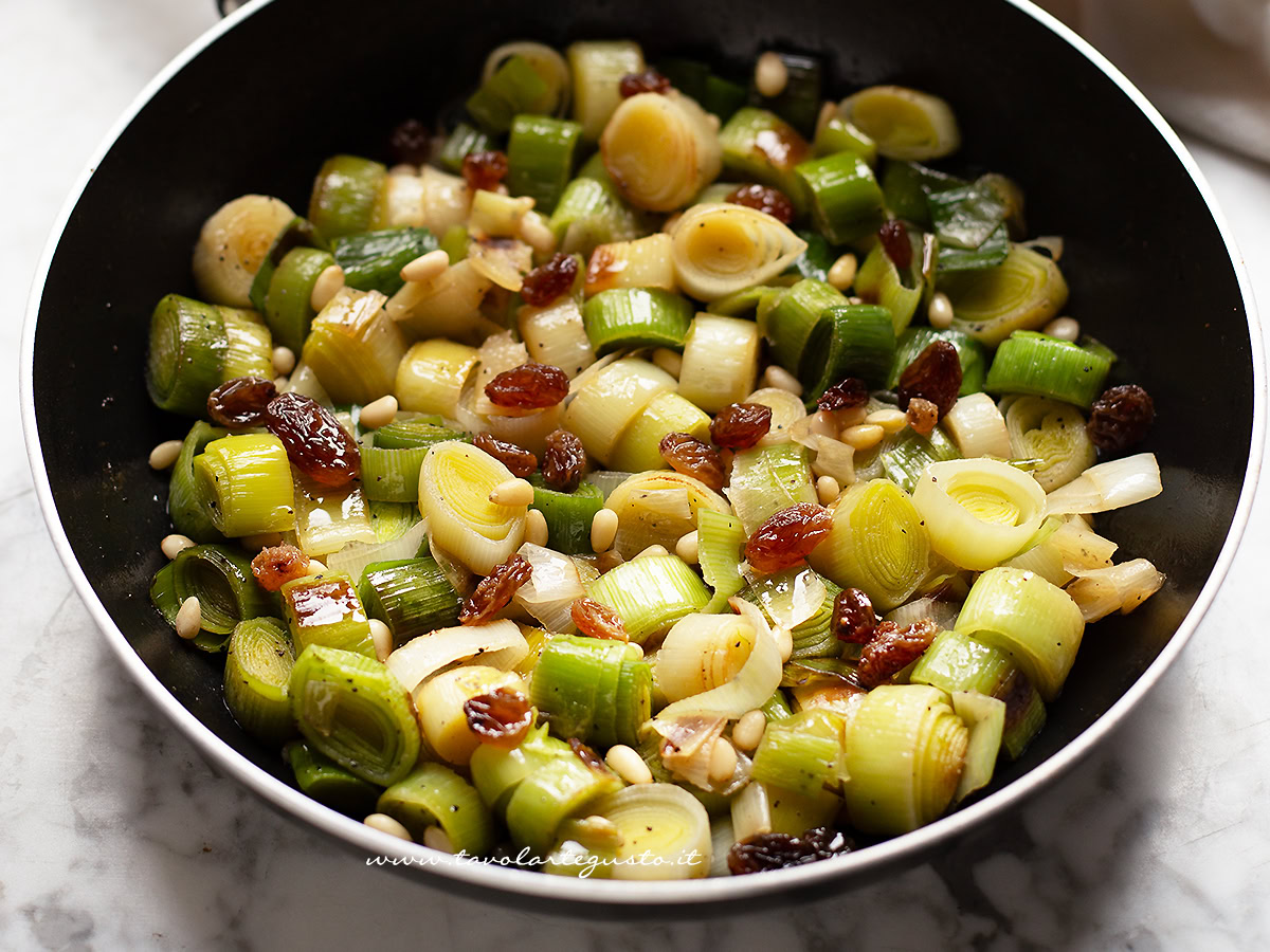 Infine aggiungete un paio di cucchiai di acqua, abbassate la fiamma e coprite con coperchio e lasciate stufare i porri in padella 15 minuti, finchè non risultano morbidi. solo alla fine sollevate il coperchio aggiungete uvetta e pinoli e lasciate cuocere ancora 5 minuti a fiamma moderata, se necessario aggiungete ancora 1 cucchiaio di acqua.