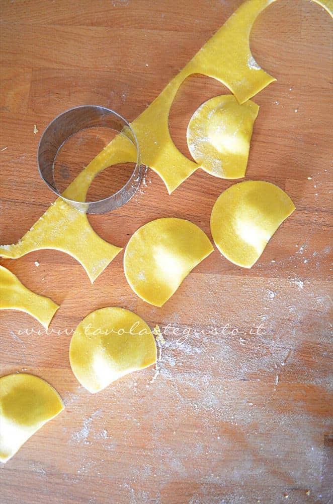 a questo punto intagliate i ravioli, io ho utilizzato un coppapasta diametro 8 cm per ricavare mezze lune tonde, ma potete realizzarli della forma che preferite: smerlati, quadrati..