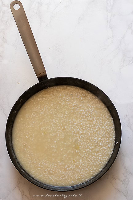 Aggiungete 1 mestolo di acqua solo quando vedete che il riso si sta per asciugare: