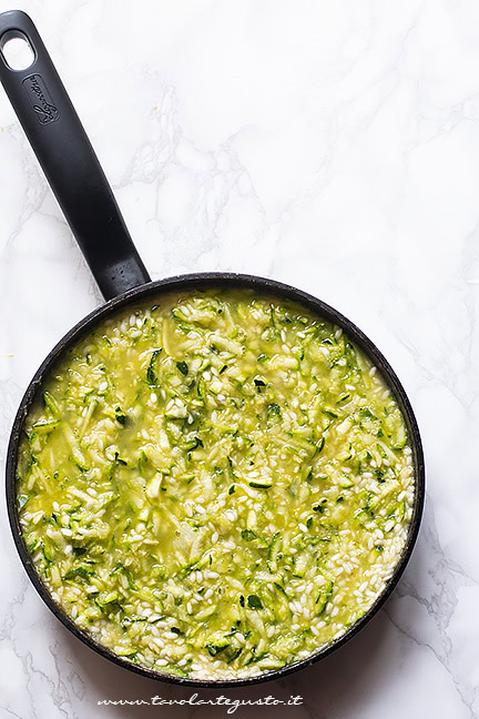 Il segreto per un risotto con zucchine perfetto è non aggiungere subito tutto il brodo, ma dosarlo a poco poco altrimenti rischiate di ottenere un risotto troppo acquoso!