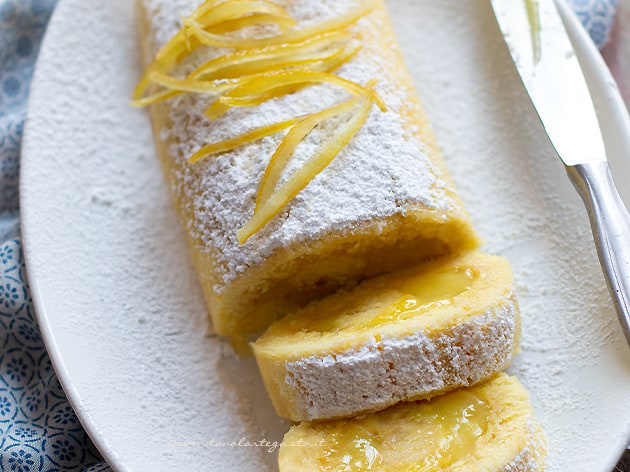 Il Rotolo al limone è un dolce goloso, elegante e profumato, alternativa alla Torta al limone classica; in questo caso realizzata con una base soffice di pasta biscotto arrotolata poi farcita con crema al limone delicata! Una spolverata di zucchero a velo e deliziose scorzette candite, completano il Rotolo con crema al limone! Riuscite ad immaginarne la bontà al morso? Soffice, a tratti cremoso, dall’irresistibile gusto agrumato! Una vera delizia!
