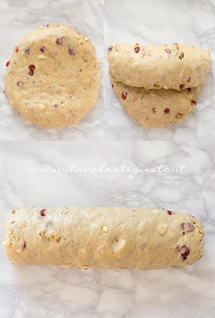 Nel frattempo che l’impasto si incorda, strizzate i mirtilli rossi che ormai si saranno ammorbiditi, infarinateli leggermente e aggiungeteli all’impasto insieme alle noci, precedentemente tagliate grossolanamente. Fate fare ancora qualche giro:
