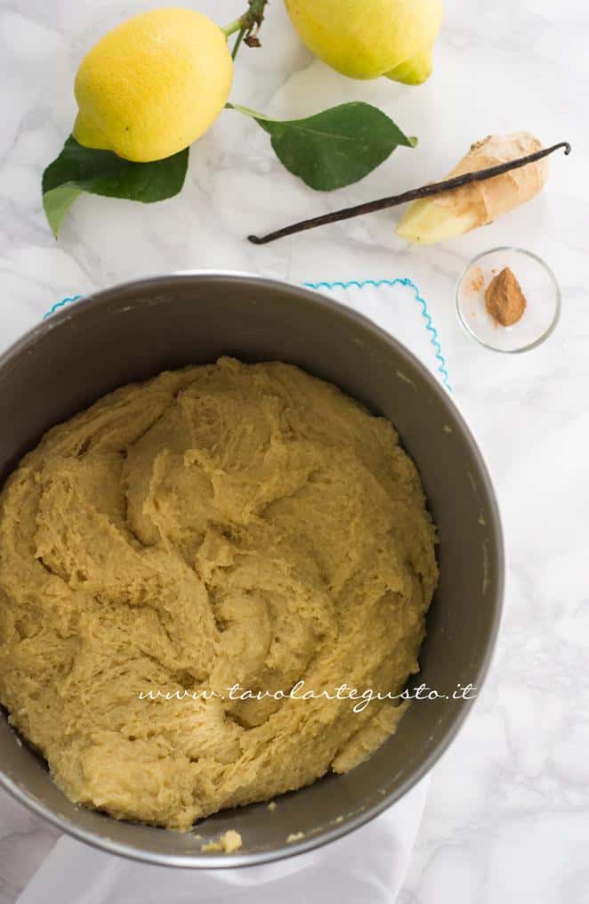 NOTA: Per questo tipo di preparazione è indispensabile utilizzare una planetaria. E’ un impasto corposo e massiccio, impossibile a mio avviso da gestire a mano. Nella ciotola grande del Kenwood si va proprio giusti, altrimenti conviene dividere l’impasto in due riprese.