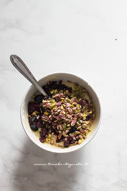 Aggiungere i pistacchi e frutti rossi oppure la frutta secca scelta: