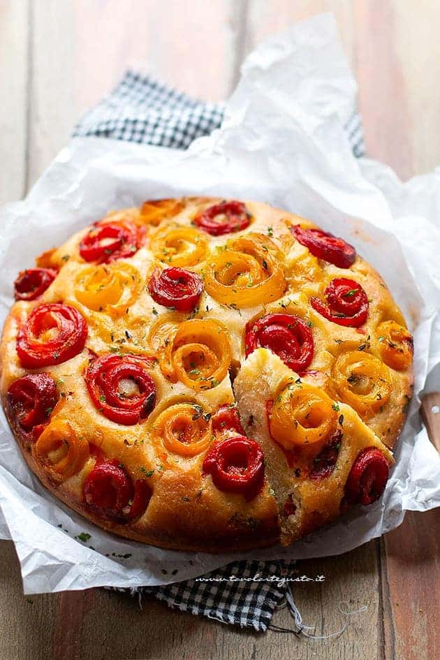 Infine, versate l’impasto in una teglia oleata e infarinata oppure foderata di carta da forno. Arrotolate i peperoni in modo da formare piccole rose e adagiate sulla superficie della torta salata i peperoni alternando i gialli ai rossi: