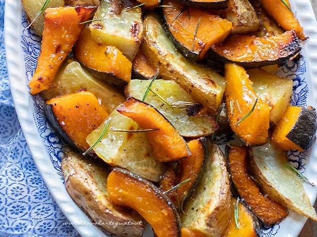 Zucca e patate sono un contorno autunnale semplice e golosissimo, che nasce dall’unione della classica Zucca al forno con le Patate al forno! Si prepara in pochi minuti e senza sbucciare gli ortaggi! Prima si tagliano in spicchi, poi si condiscono con olio, sale, rosmarino e infine si cuoce tutto insieme in forno per un risultato strepitoso! Croccanti e dorate fuori, morbide al morso, saporite, succulente da leccarsi i baffi!